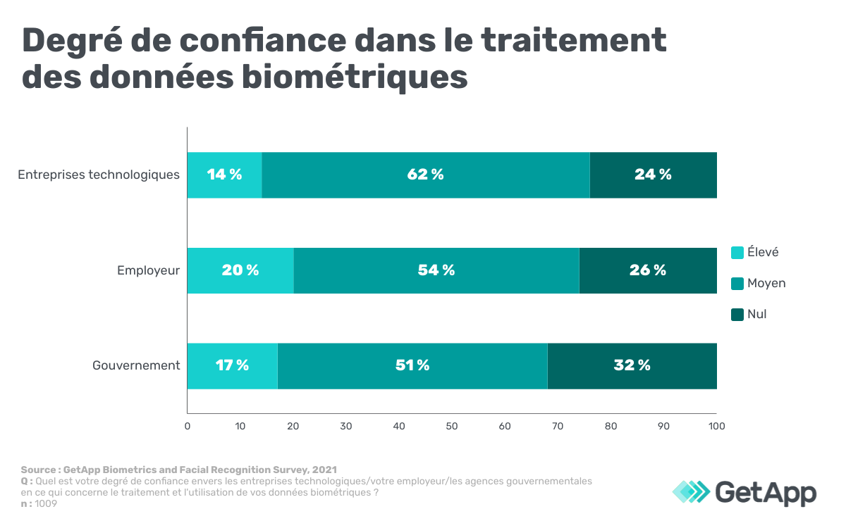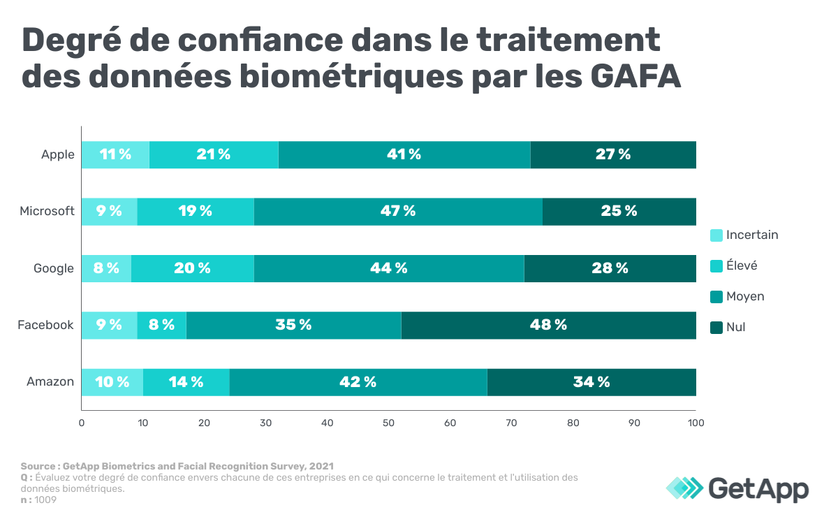 Si l’on a tendance à partager notre vie privée de manière insouciante sur les réseaux sociaux, le partage de données biométriques est une démarche que la majorité des répondants voient d’un œil circonspect. La confiance (ou l’absence de confiance) que l’on porte à certaines plateformes est le reflet de leur fiabilité dans l’œil du public. Facebook, par exemple, est l’entreprise qui inspire le moins confiance : 48 % évaluent leur niveau de confiance comme “nul”. Les diverses fuites de données qui émaillent l’actualité ou simplement sa gestion des données personnelles n’y sont sûrement pas pour rien.