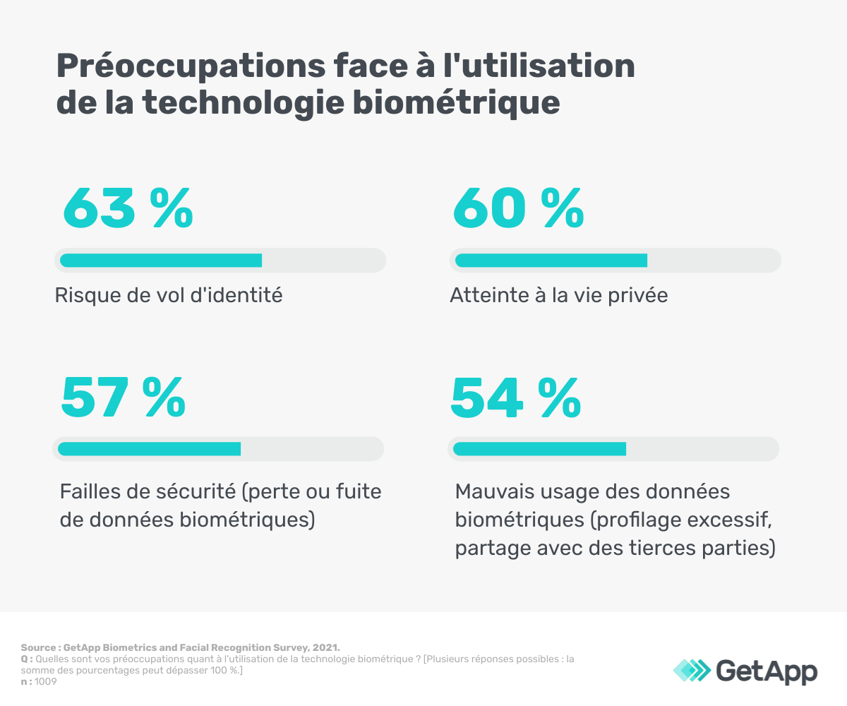 60 % des personnes interrogées craignent une atteinte à leur vie privée : il faut rappeler que les données personnelles sont protégées en Europe par le Règlement général sur la protection des données (RGPD). Les utilisateurs pourraient craindre que ces données soient utilisées à d’autres fins que celles stipulées. La Commission nationale de l’informatique et des libertés (CNIL) met également à disposition sur son site de nombreuses informations relatives aux bonnes pratiques de la biométrie.