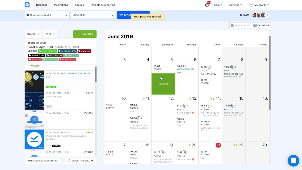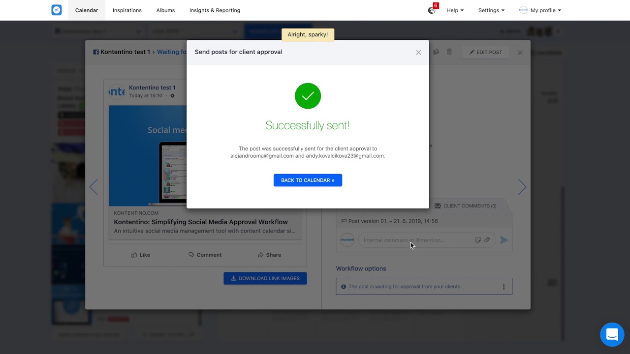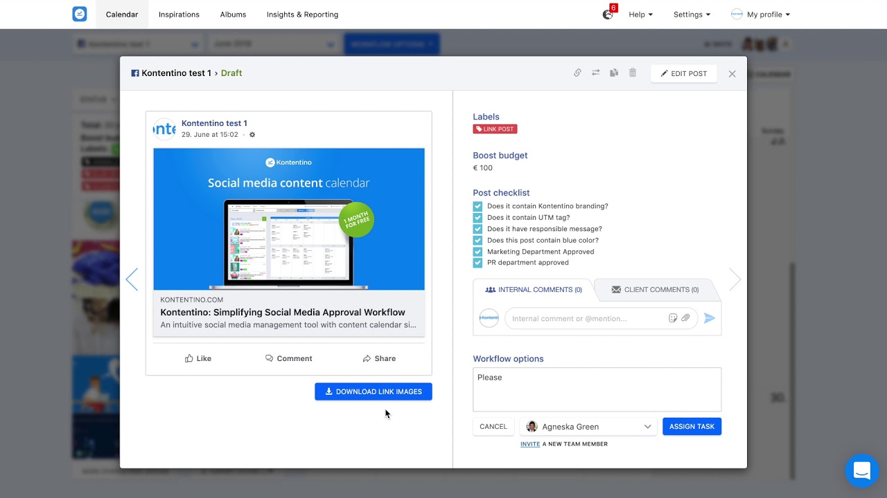 I also love its collaboration feature as it allows you to work with your client or your team at every state of your social campaign. And when your post is ready, Kontentino allows you to send it to your client for approval or to Facebook/twitter.